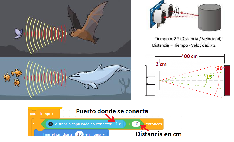Este sensor es como un murciélago 🦇: envía una onda que rebota cuando choca con algo, y luego vuelve al sensor. Así puede saber a qué distancia está un objeto.