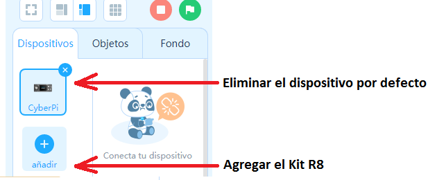Lo primero que hay que hacer es reconocer cual es el bloque lógico, "el cerebro", del kit que estamos usando. GENERALMENTE USAREMOS EL R8 DE 4 PINESLo primero es eliminar el dispositivo que viene por defecto y a continuación seleccionar el R8