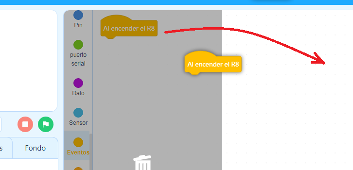 Normalmente todos los programas empiezan de la misma manera. Tenemos que ir a la pestaña de los bloques de eventos y seleccionamos el bloque "Al encender R8"