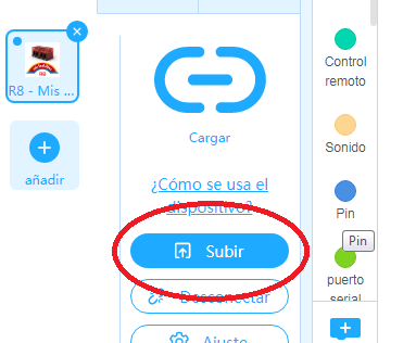 A continuación presionar el botón "Subir" para cargar el programa en el ladrillo R8.