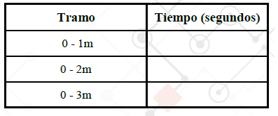 Además tendremos que marcar en el suelo: 0, 1, 2 y 3 metros. Entre todos los integrantes tomarán los tiempos que el vehículo tarda en recorrer diferentes tramos, es necesario trabajar en equipo para organizar la información.