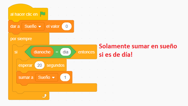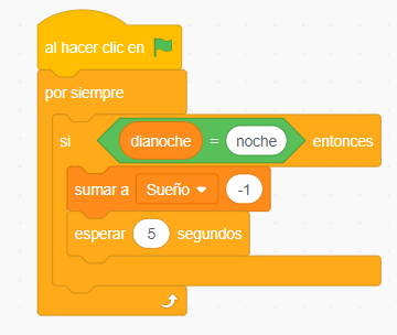 Para hacer esto, pondremos que por siempre, si es de noche, reste en la variable "Sueño"