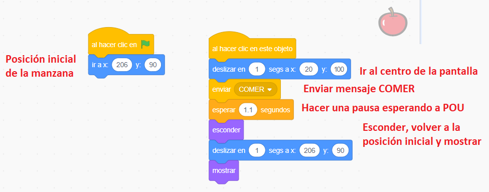 El código que pondremos hace lo siguiente: que POU se deslice hasta el lugar de la manzana.