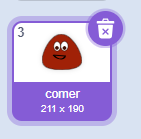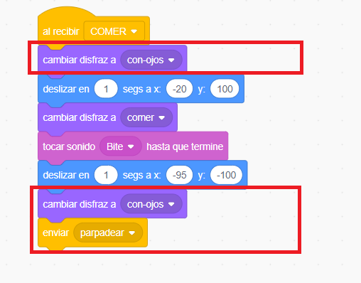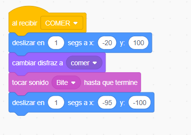 Cambiar el disfraz a comer, tocar un sonido de mordisco, y volver a la posición anterior (podés ver la posición inicial de POU en donde está la bandera verde).