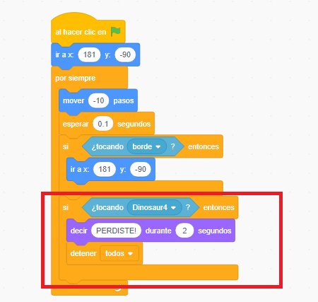 Lo primero que haremos es ubicar el Dino en la posición que queremos y poner este código para que se vea el movimiento de caminar.
