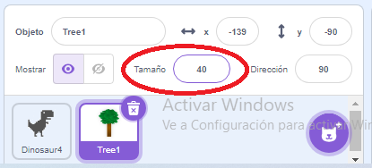 También tendremos que cambiar el tamaño del Dino, para que quede bien con el tamaño de la pantalla (en nuestro caso lo pusimos en tamaño 40.