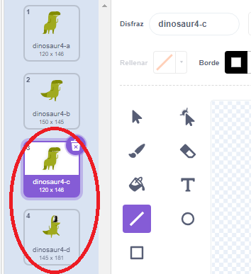 Una vez seleccionado el personaje principal, tenemos que verificar que tenga disfraces adecuados para que parezca que corra o camine. En el caso de Dinosaur4 que es el que elegimos, vamos a eliminar los disfraces en los que está caminando o comiendo.