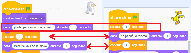 Ahora vamos a continuar el diálogo, no te olvides que tendrás que poner bloques de esperar para que parezca que uno le está respondiendo al otro .... en nuestro caso vamos a continuar con el pájaro.