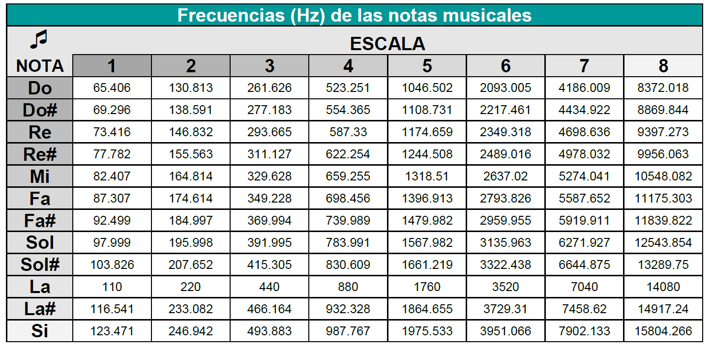 Te dejamos también una tabla con las distintas notas musicales para que puedas hacer otras canciones