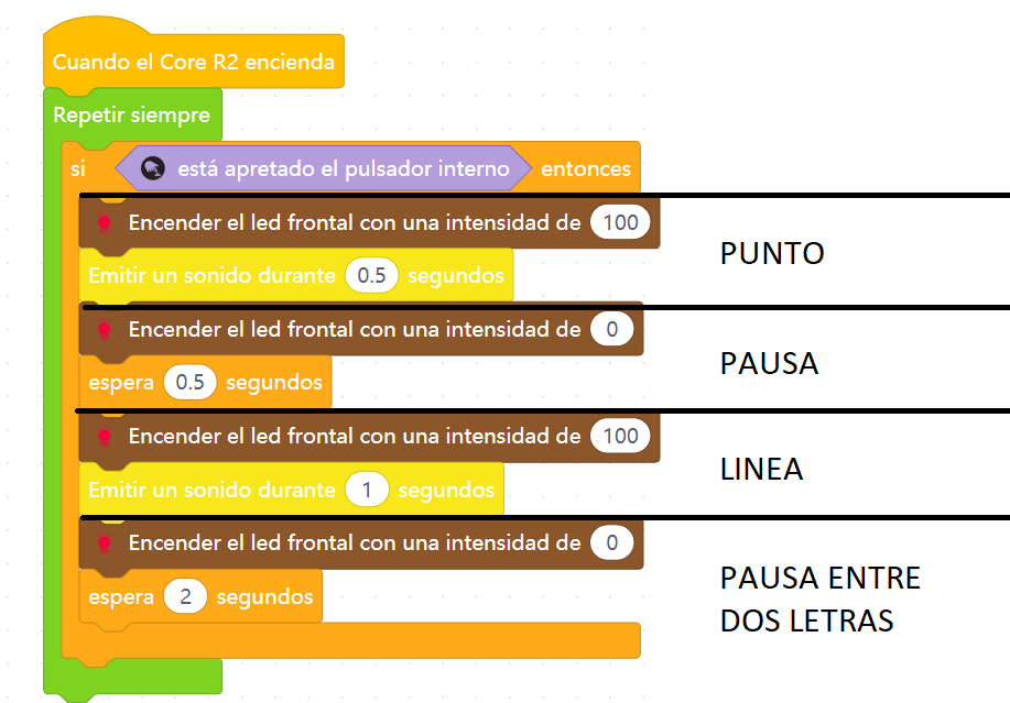 En este segundo código enviaremos el código equivalente a la letra A, con sonido y con luces.